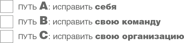 Возьмем, к примеру, Адриану, одного из руководителей высшего звена компании. Она решила прочитать эту книгу. Прежде чем она перейдет к Навыкам ответственности, ей нужно решить, как она хочет об этом читать. Да-да, все правильно — как. Какова цель чтения: исправить себя, свою команду или организацию? Подумав немного, она решает, что хочет в первую очередь сосредоточиться на себе, потому что стремится узнать, что поможет ей в повседневной работе, хотя и признает: «Наверное, я вернусь и пройду путь заново, уже от имени моей команды».