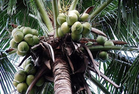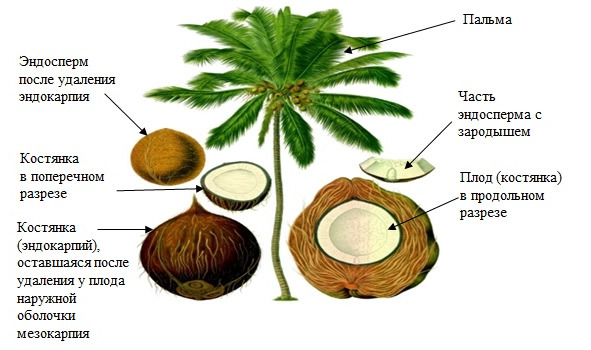 Кокосовый орех растет на пальме, высота которой 27—30 м. Плод — костянка (в народе называют кокосовый орех), 15—30 см в длину, весом 1,5—2,5 кг. Плоды растут группами по 15—20 штук.