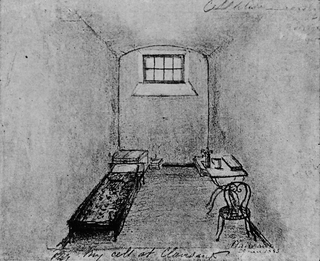 Рисунок Петра Кропоткина, изображающий его камеру в тюрьме Клерво. 1883 год В 1882 году Кропоткина арестовывает французская полиция. Под давлением российского правительства его приговаривают к пяти годам лишения свободы. Протесты со стороны Виктора Гюго, Герберта Спенсера, Эрнеста Ренана, Алджернона Суинберна и многих других интеллектуалов и общественных деятелей не смогли повлиять на решение суда. Кропоткина сперва отправляют в тюрьму Лиона, а потом переводят в казематы Клерво.