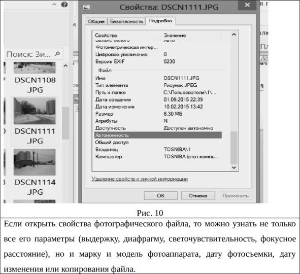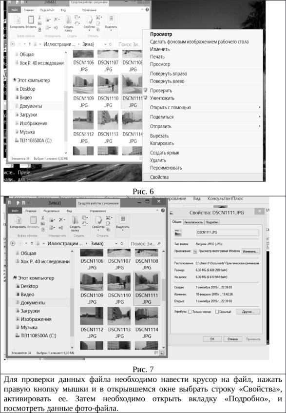 — На самом деле фокусное расстояние можно посмотреть с помощью компьютера. Для этого необходимо навести курсор на нужный фото-файл и открыть окошко свойств. Затем открыть вкладку подробно и найти там все параметры фотоснимка. Следователь открыл на своем компьютере фотографию и показал, как находить ее свойства. (Рис. 6—10)