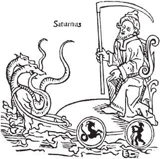 Рис. 1.77 Средневековое изображение планеты Сатурн с косой (серпом) смерти в руках. Взято из средневековой книги: Leupoldus de Austria, Compilatio de Astrorum Scientia, cuts. 1489 год [150]. Книгохранилище Пулковской обсерватории (Санкт-Петербург). См. также [76], с. 181, илл. 92.