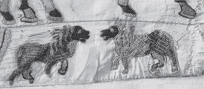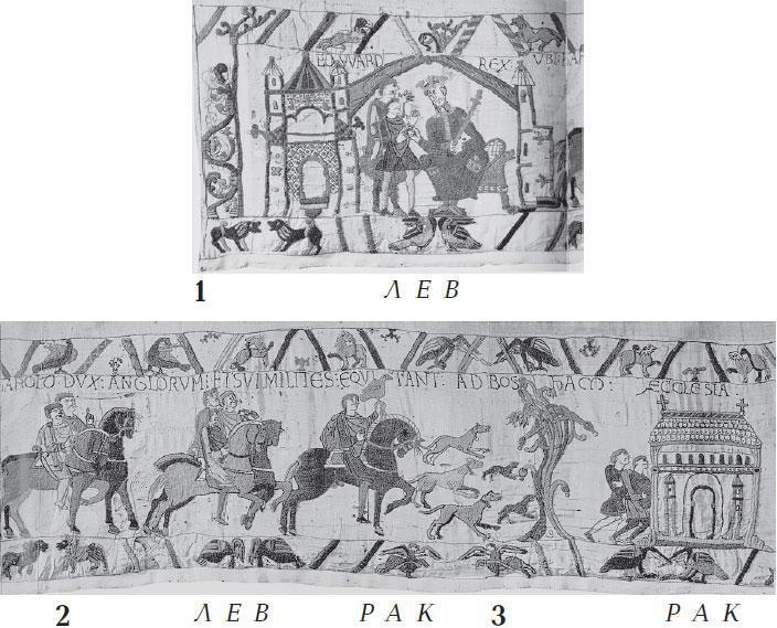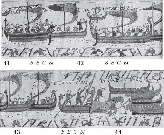 Воспользуемся подробным описанием ковра из Байе в фундаментальном издании [138], с. 10–12. В нем дано полное цветное, а также черно-белое воспроизведение ковра, его научное описание и комментарии. Издатель и комментатор [138] – сотрудник Британского Музея Давид М. Вильсон.