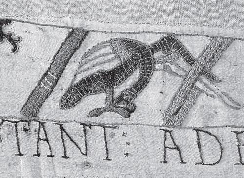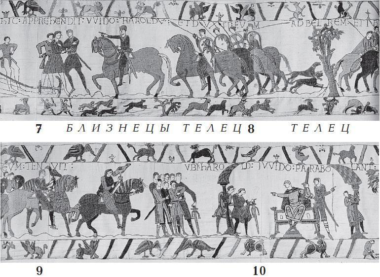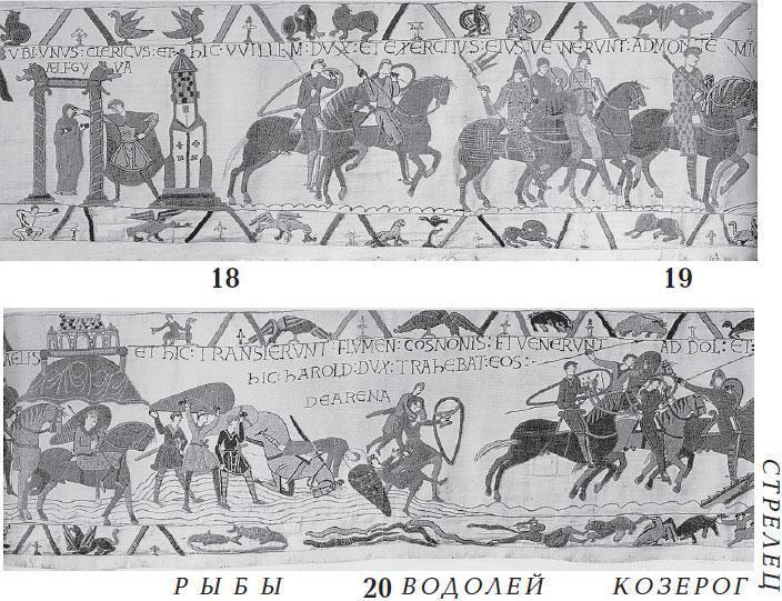 Может быть, в эпоху создания ковра из Байе астрономическая символика еще не совсем устоялась. Как мы отмечали в [НХЕ], глава 1, см. также ХРОН3, подобные разночтения встречаются на старинных зодиаках и в отношении созвездия Ворона. Иногда его помещали рядом с зодиакальным Львом – то есть там, где расположены созвездия Рака или Девы. Сегодня созвездие Ворона тоже существует, но не принадлежит зодиакальному поясу, хотя и находится рядом с ним, по соседству с созвездием Девы.