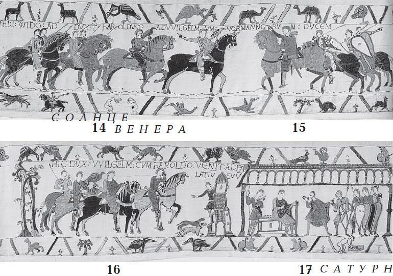 Может быть, они (в том числе и Д. М. Вильсон) просто не распознали другие созвездия и не придали значения астрономической символике, явно присутствующей на ковре из Байе? Возможно. Насколько нам известно, НИКТО И НИКОГДА НЕ ПРЕДПРИНИМАЛ ПОПЫТОК АСТРОНОМИЧЕСКОГО ДАТИРОВАНИЯ КОВРА ИЗ БАЙЕ И ДАЖЕ НЕ ГОВОРИЛ О САМОМ ФАКТЕ ПРИСУТСТВИЯ НА НЕМ ЗОДИАКА С ГОРОСКОПОМ. Для нас ничего удивительного здесь нет. Обычно историки предпочитают «не замечать» зодиаков на старинных памятниках. Или же (когда картина уж совсем очевидна) начинают туманно рассуждать об их якобы чисто религиозном смысле. По-видимому, стараются уйти подальше от необходимости астрономически датировать подобные изображения и (что, вероятно, главное) увести от такой «опасной» мысли читателя. В тех же сравнительно немногих случаях, когда историки и помогающие им астрономы все-таки пытаются датировать старинный зодиак, они всячески стремятся удревнить его дату путем всевозможных натяжек и даже преднамеренных искажений. Дабы любой ценой втиснуть астрономический ответ в привычную скалигеровскую хронологию. С которой они никак не хотят расставаться. Некоторые примеры подобной» деятельности» мы привели в нашей книге «Новая хронология Египта» [НХЕ]. См. также ХРОН3.