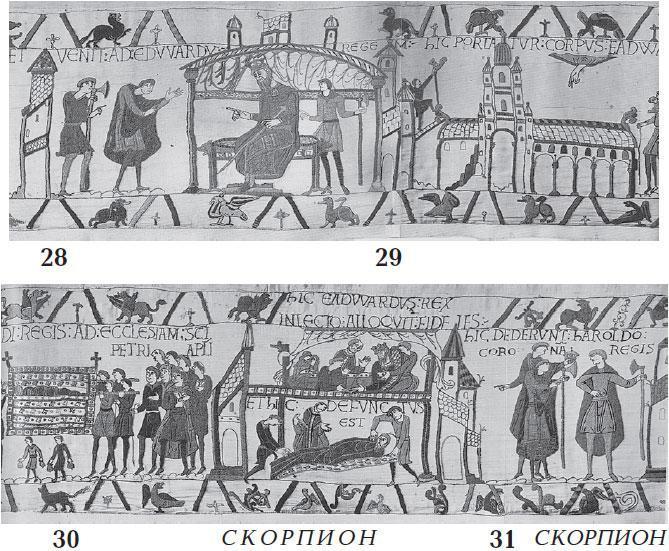Кроме того, нельзя не отметить, что хотя основная широкая полоса ковра отведена для неастрономических изображений, однако в ней именно в данном месте ковра, рядом со «скорпионами», на листе 30, помещена смерть царя Эдварда, см. рис. 1.65. Тем самым, как бы совмещены смертельно опасные скорпионы и смерть человека.