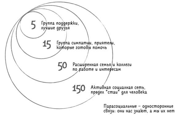 Все знают пословицы «скажи мне, кто твой друг, и я скажу, кто ты» или «с кем поведёшься, от того и наберёшься». Они уже стали весёлым клише, как «London is the capital of Great Britain». Каждый второй их произносит, но осмысленно никогда не задумывался над своим окружением и его влиянием. Окружение — один сильнейших факторов, влияющих на вас. Каждый человек держит во внимании социальные связи со 150 людьми. Настоящие социальные связи, а не все 600 друзей в социальной сети. Цифру 150 подтвердил эволюционный психолог Робин Данбар ещё в 60-х годах. Всех 150 человек в своей теории он называет друзьями, но на самом деле реальные друзья — это примерно 5 человек. Затем идет 15 человек приятелей и знакомых. Из них складывается ваш близкий круг общения.