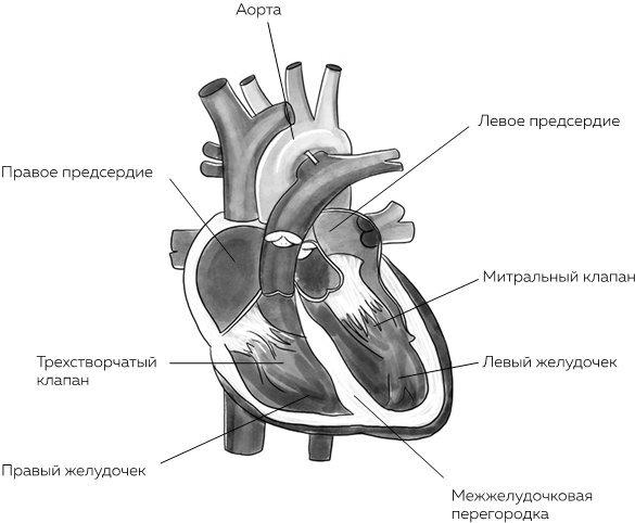 Сердце – полый мышечный орган, состоящий из четырех камер: двух желудочков и двух предсердий. В камерах содержится кровь. Непрерывно сокращаясь, мышечные стенки обеспечивают ток крови по всей разветвленной сети сосудов. По артериям сердце проталкивает артериальную кровь, ярко-алую и насыщенную кислородом, а от органов к сердцу по венам возвращается венозная кровь, темная, содержащая углекислый газ. Чтобы эти «транспортные ветви» не смешивались друг с другом, сердце разделено пополам перегородками – межжелудочной и межпредсердной. В здоровом сердце они полностью закрыты, в них нет никаких отверстий, и кровь из одной половины сердца никогда не поступает в другую.