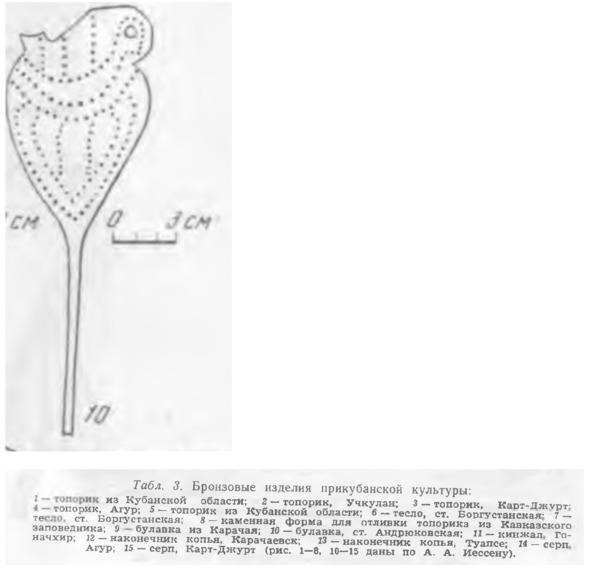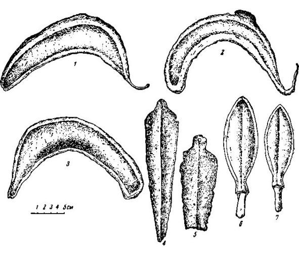 Из найденных в погребениях предметов сохранились только бронзовые изделия — серпы, кинжалы и двулезвийные ножи. Бронзовый инвентарь из курганов является типичным для конца периода бронзы. Все три серпа принадлежат к позднему типу серпов — так называемых «крюкастых». Серп из кургана №1 имеет равномерно изогнутую утолщенную спинку, без резкого перегиба; металл вливался почти на середине изогнутой части спинки (рис. 1, 1). Серп этот наиболее близок серпу из станицы Андрюковской (собрание Краснодарского музея) и относится ко второй группе серпов эпохи бронзы, выделяемой А. А. Иессеном [ref] А. А. Иессен. Прикубанский очаг металлургии и металлообработки в конце бронзового века. МИА. №23, 1951, стр. 111, рис. 48, I. [/ref]