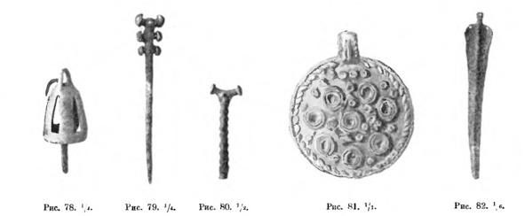 Близ этого кургана, в отчетном году исследовано еще 9 незначительных насыпей. Из них 6 содержали погребения белореченского типа и ничего нового не дали. Что же касается трех остальных, из коих две были сложены из голышей, то они относятся к более древней, вероятно бронзовой эпохе. Сильно истлевшие костяки лежали здесь в материковых ямах с бедной обстановкой, состоявшей исключительно из каменных брусков, медных топоров, кинжалов и привесок, а так же глиняных бус. Сравнительным богатством отличался только курган №8, выдававшийся и своей высотой (2,13 м). В его насыпи вверху обнаружилась могила, при которой оказались две медные шпильки различной величины (рис. 79 и 80), медный круглый медальон-привеска (рис. 81), медный кинжал (рис. 82), медные бусы, медное колечко или серьга и, наконец, глиняный горшок грубой работы. Отчет императорской археологической комиссии за 1897 г. Санкт-Петербург, 1900, С. 53