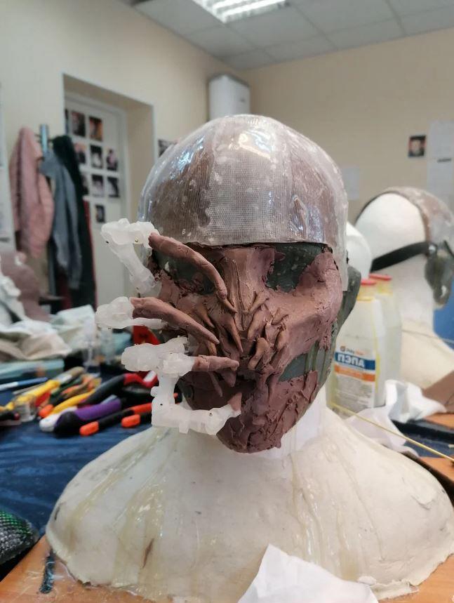 «Когда мы обсуждали образ Повелительницы мух, режиссер Рустам Мосафир сказал: „Сделайте так, как будто она сняла голову с мухи и надела на себя“. Меня зацепила эта фраза, и потом я от нее отталкивалась, когда придумывала конструкцию. Мы с Оксаной Кручиной, художницей по гриму, решили, что это будет не пластический грим, а маска с элементами аниматроники. Верхняя часть головы со жвалами и дыхательными мешками прикреплена к шлему из эпоксидной смолы, потому что для аниматронических деталей нужна жесткая основа. А нижняя часть челюсти — это уже силиконовая деталь, которая приклеивалась на подбородок актрисы», — рассказывает ассистентка художницы по гриму Елена Григорьева, которая занималась пластическим гримом и спецэффектами.