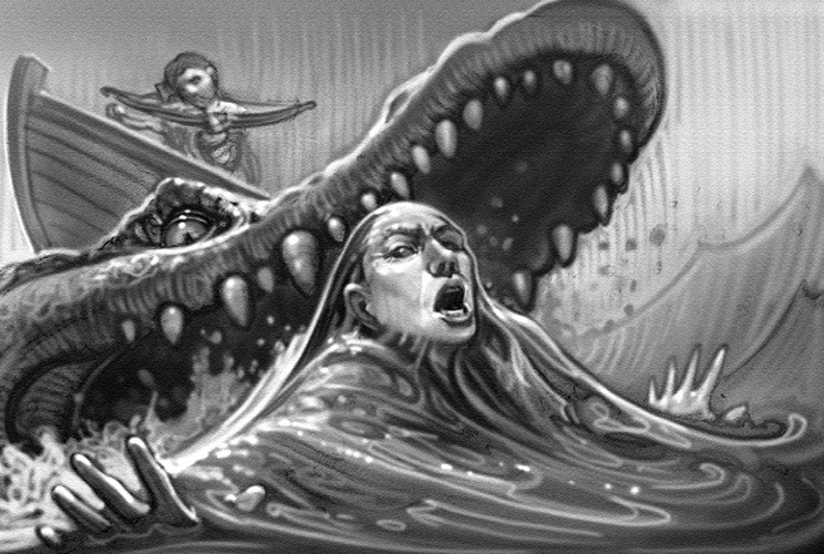 Охотник спрыгнул за борт. Вода доходила ему до пояса. Поднатужившись, Гримслейд попытался сдвинуть лодку с места. Суденышко тронулось и заскользило вперед. Охотник приготовился запрыгнуть обратно, но не тут-то было — на глазах у изумленных фамильяров и детей неведомая сила утянула его под воду!