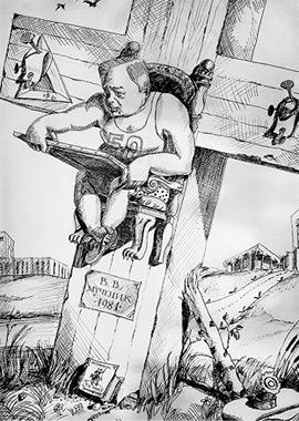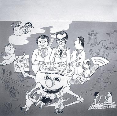 «Последний день башенной эпопеи». Групповая карикатура на архитекторов Ташкента. 1955