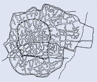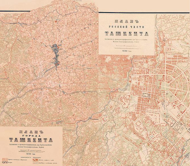К моменту российской колонизации (1865) Ташкент был крупнейшим городом Центральной Азии по площади и населению, хотя и не имел столичного статуса Коканда, Хивы и Бухары. Холмы ташкентского оазиса скрывали немало древних и раннесредневековых городищ и замков, однако собственно исторический город с IX–X вв. развивался вокруг ядра Чорсу1, к которому примыкали четыре городских района-даха: Кукча, Шейхантаур, Сибзар и Бешагач. Главные улицы, подобно артериям, сходились к Чорсу, где располагался самый большой городской базар. От них более узкие улочки, разветвляясь, расходились к периферийным кварталам с их небольшими мечетями и махаллями2. В черте исторического города было немало памятников средневековой архитектуры и как минимум три крупных культовых комплекса: Хаст-Имам — в квартале Сибзар, Шейхантаур — к востоку от Чорсу и Регистан — непосредственно в главном городском ядре. Обнесенный крепостной стеной, город располагался по правому берегу канала Анхор за исключением хорошо укрепленной крепости Урда, резиденции наместника кокандских ханов, от которых Ташкент административно зависел. Урда была выстроена на левом берегу Анхора, что позволяло крепости предохранять город от внешних вторжений и защищать правителя от внутренних волнений.