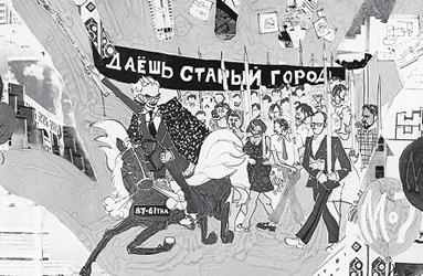 Карикатура «Даешь старый город!» (на коне — А. Косинский) из стенгазеты Ташгипрогора «Градостроитель». 1977