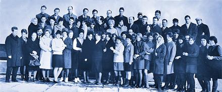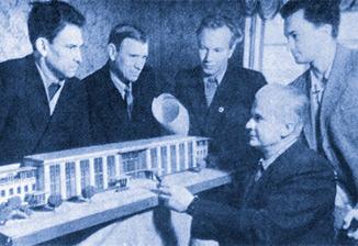 Е. Сепетый, Д. Вантанников, С. Рыжов, Л. Травянко, В. Русанов у макета вокзала. Нач. 1960-х