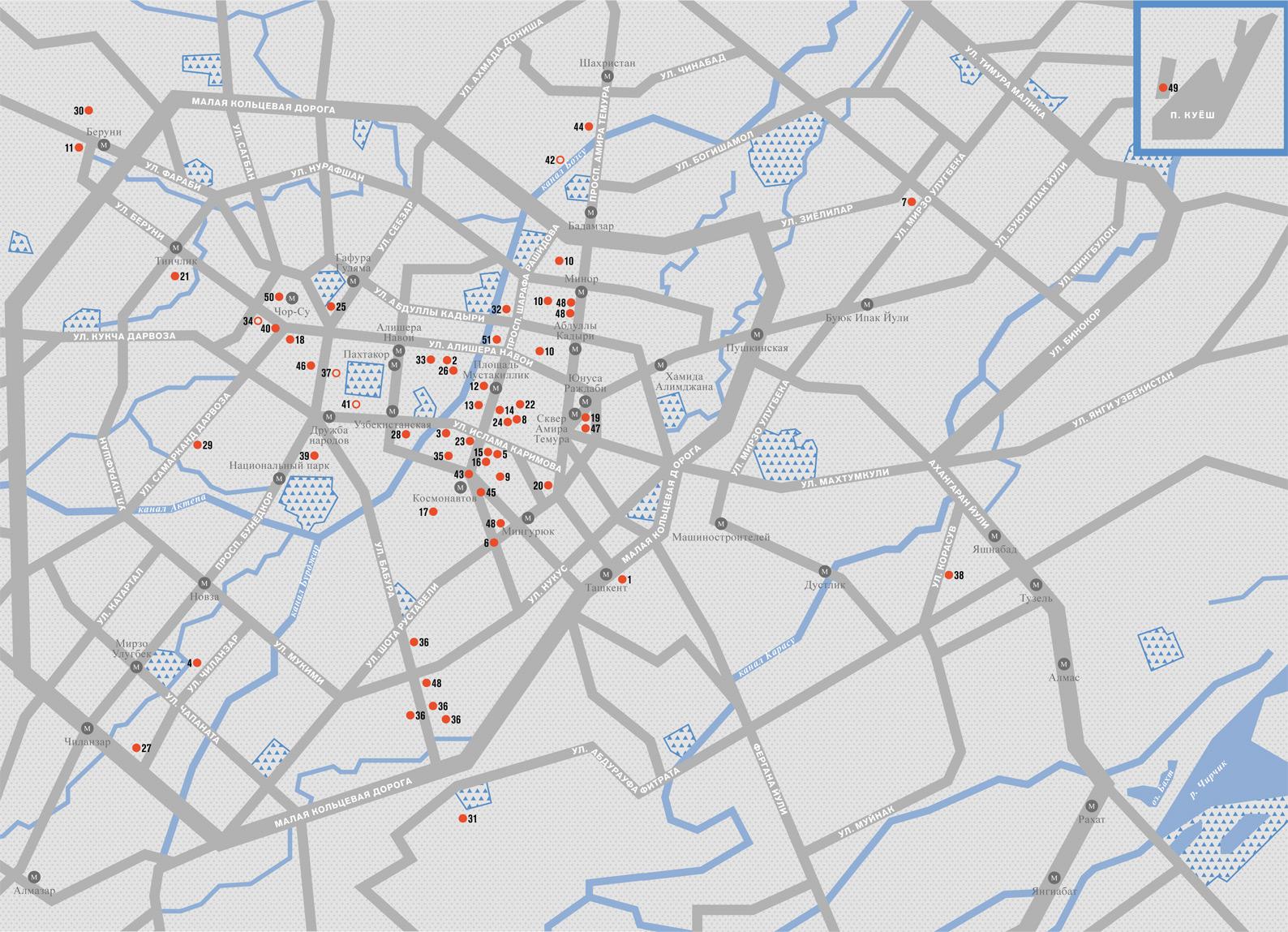 Хотя во вступительной части книги размещена карта для облегчения перемещений по городу, мы включили в обзор немало зданий, снесенных или серьезно перестроенных после распада СССР. Это решение было принято в начале работы, приступая к которой мы ясно осознавали уязвимость некоторых модернистских зданий, перестраиваемых на наших глазах. Поэтому наша книга является скорее каталогом воображаемой выставки в еще не существующем ташкентском Музее архитектуры, нежели практическим гидом для туристических прогулок по городу. Конечно, этот «каталог» включает немало описаний и визуальной информации, но его «кураторской» сверхзадачей остается показ логики и основных тенденций архитектурной эволюции Ташкента в 1960–1980-е годы на примере отобранных сооружений. Возможно, такая исследовательская и авторская цель помогла бы избежать подспудных опасностей «путеводителя», предрасполагающего к быстрому удовлетворению любопытства и выдаче ожидаемых ответов на предсказуемые вопросы.