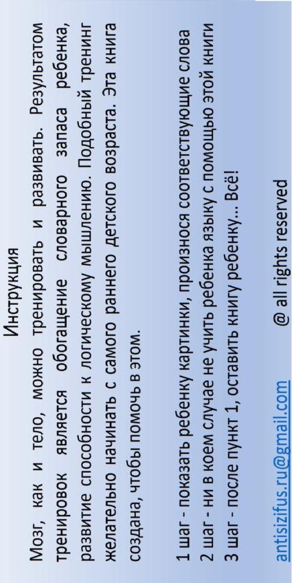 Автор не является психологом детей, не учителем и не другим специалистом в этой сфере. Автор является отцом двух детей. Он делится своим опытом. Инструкции — Цель книги тренировать мозг ребенка, притом без вмешательства родителя, кроме тех случаев, где ребенок не знает имя предмета на рисунке. Все остальное просто — дать ребенку эту книгу, и все, что ребенок решит сделать с ней, — это его дело. Книга не учебник русского языка. Для детей возраста год-два до школы.