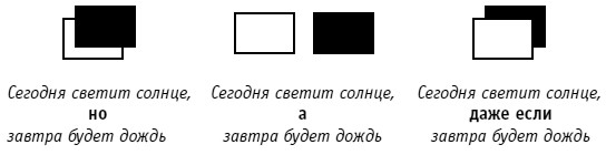Слова служат не только для воспроизведения нашего опыта. Часто они помещают его в своеобразную рамку, в которой одни аспекты выдвигаются на передний план, а другие служат им фоном. Рассмотрим, например, соединительные слова «но», «и/а» и «даже если». Когда мы связываем свои идеи или переживания с их помощью, слова заставляют нас фокусировать внимание на различных аспектах одних и тех же переживаний. Фраза «Сегодня светит солнце, но завтра будет дождь» вызывает в нас озабоченность завтрашним дождем, при этом мы практически не учитываем тот факт, что сегодня солнечно. Если связать эти же утверждения словом «а»: «Сегодня светит солнце, а завтра будет дождь», то смысловое ударение падает в равной степени на оба события. Если же сказать «Сегодня светит солнце, даже если завтра будет дождь», то наше внимание будет сфокусировано на первом утверждении, а второе останется на заднем плане (рис. 2).