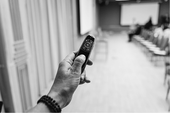 Поэтому во избежание переживаний спикера (а я видела, как девушка на выступлении начала злиться и ругать организаторов, которые «даже батарейки нормальные вставить в кликер не могут») во время его подготовки к выступлению сразу покажите, куда нужно направлять кликер, чтобы он срабатывал (стол модератора, пультовая, зона работы технической группы). Приемопередатчик стандартного кликера, как правило, включается в компьютер, с которого запускается презентация.