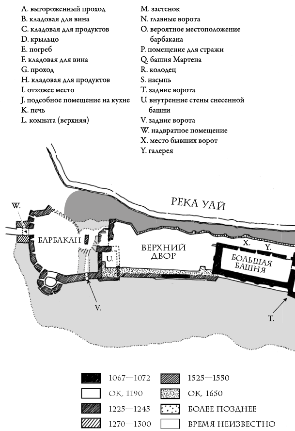 Входом служат Большие ворота в восточной оконечности замка. Через них посетители попадают в просторный, заросший травой внутренний двор площадью около восемнадцати квадратных метров. Южнее ворот тянется стена высотой в двенадцать метров, заканчивающаяся громадной башней в юго-восточном углу замка — плоской с одной стороны, полукруглой с другой. Сегодня последняя известна как башня Генри Мартена, по имени политического узника XVII века, проведшего здесь двадцать последних лет своей жизни. С севера, напротив башни Мартена, примыкая к стене, глядящей на реку, теснятся постройки XIII века — так называемая жилая часть. Если приглядеться к ней внимательнее, окажется, что она состоит из двух больших каменных залов, с комнатами, погребами, кладовыми, и расположенными прямо над рекой отхожими местами.
