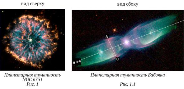 Что общего между конфигурациями: Планетарной туманности Бабочки и сечения сферы NGC 6751? На первый взгляд, разница в конфигурации форм очевидна и в действительности, позиции несравнимы. Однако, в случае, когда положения фигуры, находящейся по отношению к земному наблюдателю фронтально, он будет иметь: вид спереди — сферу Красного гиганта. Когда, вид сбоку, то предстанет Планетарной туманностью Бабочки, которая, в сечении А–С, покажет фронтальный вид.