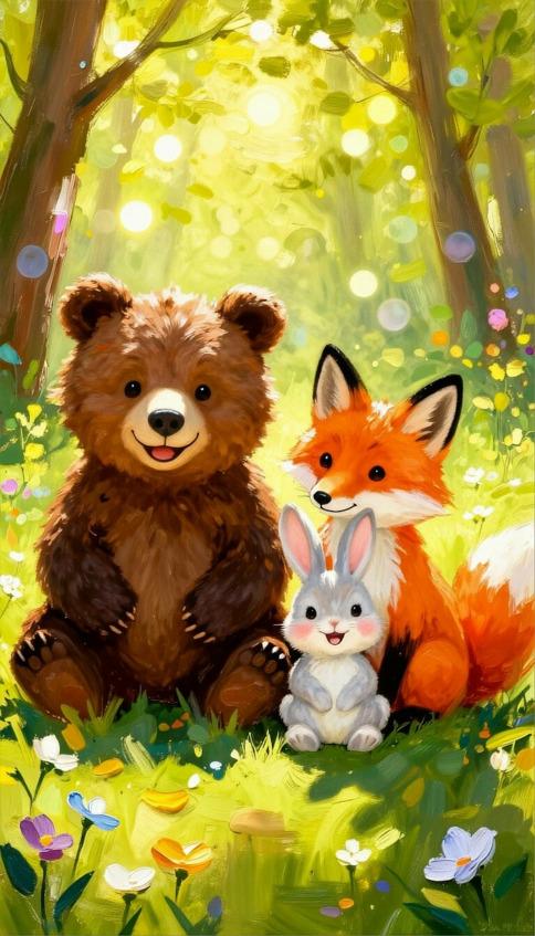 В одном огромном, шумном и зелёном лесу, где высокие сосны подпирали небо пушистыми лапами, а ветер играл в прятки с листвой, жили-были три неразлучных друга: медвежонок Миша, зайчонок Зая и лисёнок Леся.