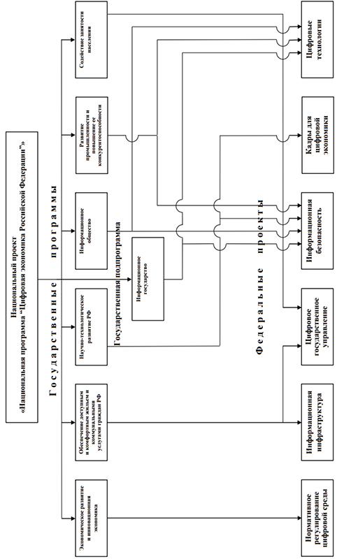 На основе приведенных в табл. 1 данных можно сделать вывод о том, что национальный проект «Национальная программа “Цифровая экономика Российской Федерации”» в целях единства системы государственного стратегического планирования интегрирован с государственными программами РФ и соответствующей подпрограммой, что обеспечивается наличием у них общего структурного элемента — федерального проекта Программы29.