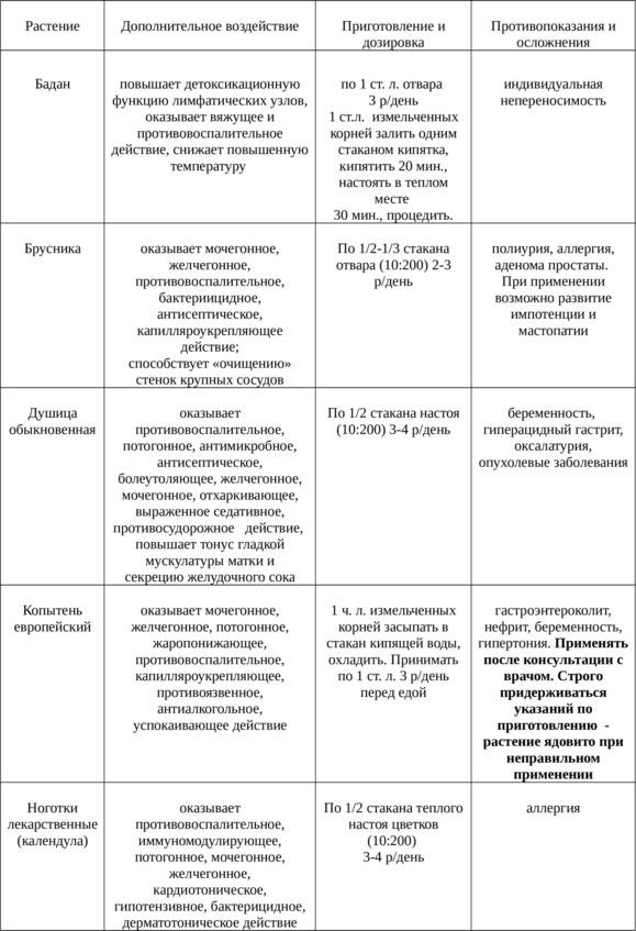 В таблице 1 представлены лекарственные растения, применение которых является достаточно эффективным способом стимуляции оттока тканевой жидкости.