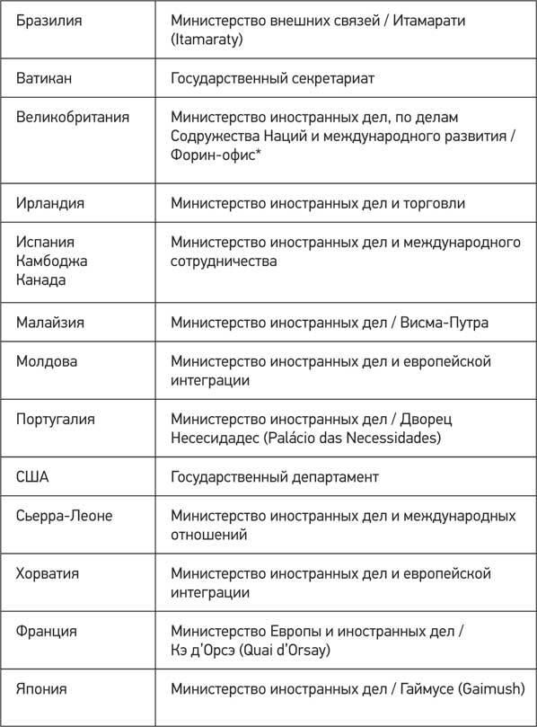 * Метонимия «Форин-офис» использовалась до переименования британского внешнеполитического ведомства в Министерство иностранных дел, по делам Содружества Наций и международного развития (англ. Foreign, Commonwealth and Development Office).