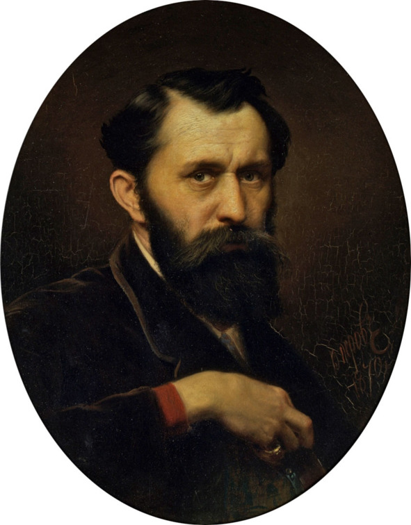 В Третьяковке хранятся почти все его лучшие картины. Но сначала — вот, посмотри… Это репродукция картины, которая находится в Киеве. Здесь Перов написал себя…