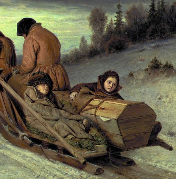 — Да. Ему разрешили. И тогда Перов написал вот эту картину. И это была целая революция в русском искусстве! Смотри: она называется «Проводы покойника».