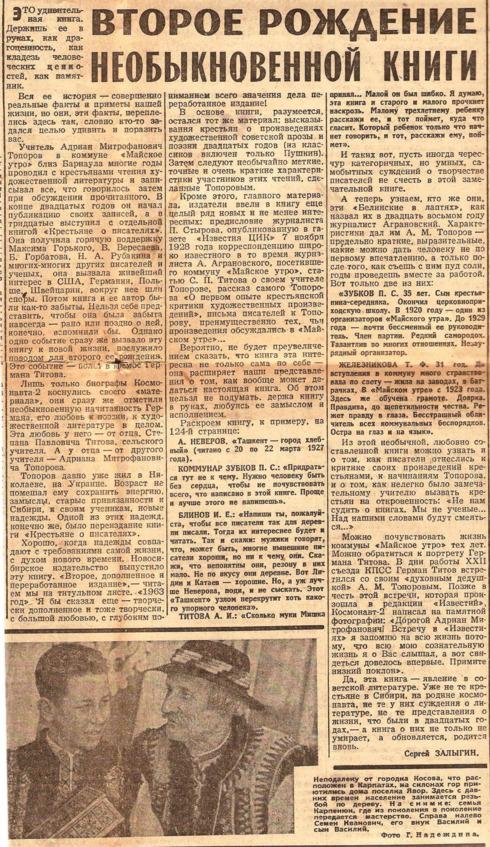В №57 от 7 марта 1964 года популярная московская газета «Известия» напечатала отзыв о книге А. М. Топорова «Крестьяне о писателях».