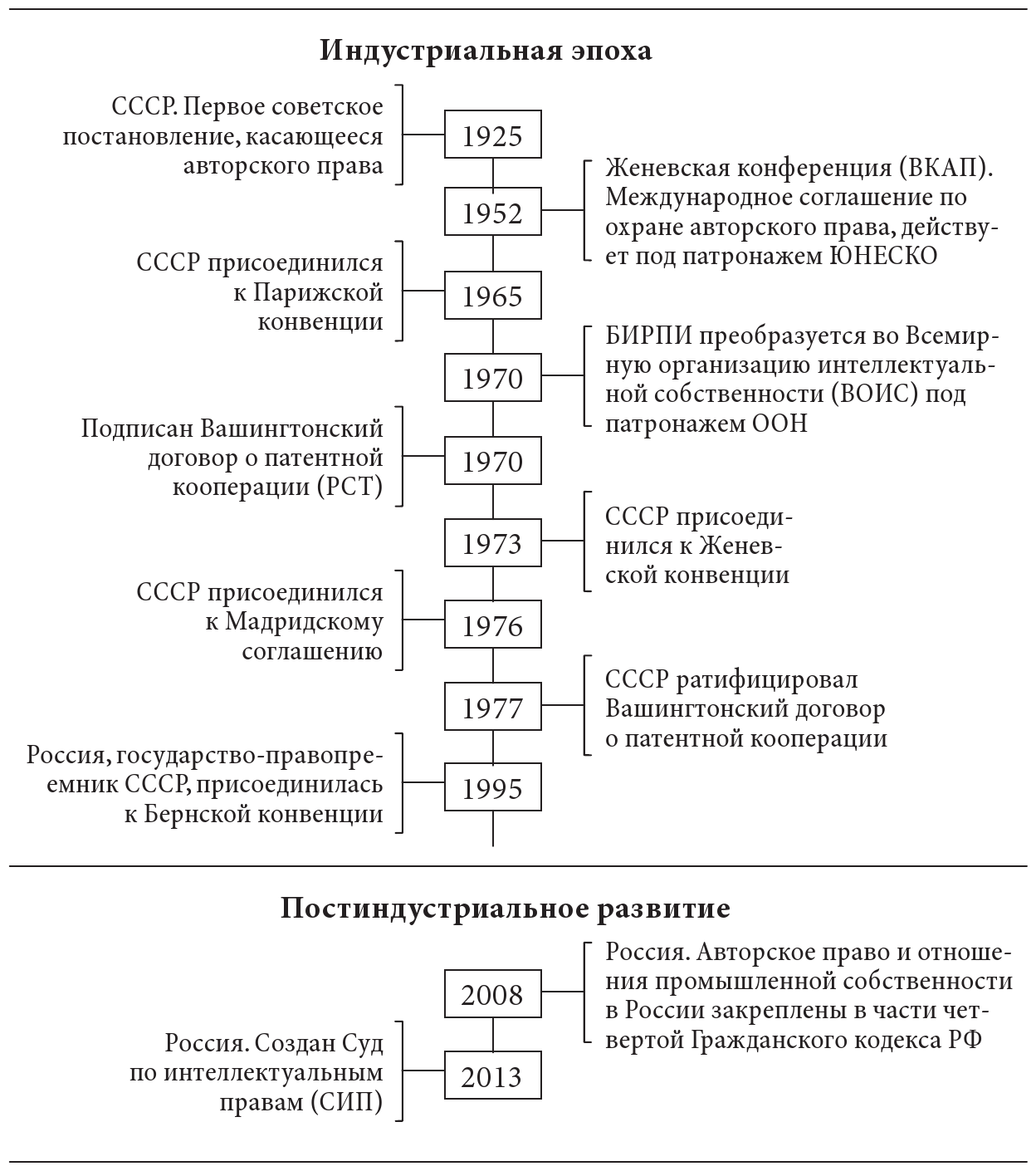 Почему же интеллектуальное право так актуально в России именно теперь? Философы и социологи выделяют несколько этапов развития общества. Индустриальное общество, возникшее с конца XVIII века, после серии буржуазных революций в Европе, было ориентировано на развитие промышленности, а следовательно, и развитие бизнеса. Во всём мире вершиной его стало конвейерное производство. В СССР этот этап был достигнут в 50–70-е годы XX века.