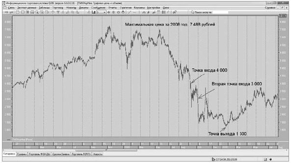 Поэтому неудивительно, что и ценные бумаги российского фондового рынка, традиционно сильно коррелирующие с мировыми ценами на энергоносители и металлы, продолжали дешеветь даже после того, как их стоимость уже упала в два раза. Когда акция «Норникеля» упала до 3000 рублей (минус 25 % от цены входа Михаила и минус 50 % от исторического максимума), Михаил решил занять денег (кто же откажет миллионеру в кредите?) и усилить свою позицию. Если покупка по 4000 рублей за акцию обещала быть прибыльной сделкой, то по 3000 – тем более. Как говорил потом Михаил, на тот момент эта сделка казалась ему вторым самым удачным решением в его жизни.
