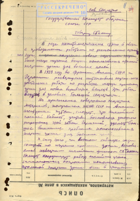 «… стоит еще ряд очень больших трудностей и потребуется проведение большой научно-исследовательской работы, однако, как нам кажется, трудности эти не носят принципиального характера. Нетрудно видеть, что если вопрос о техническом использовании внутриатомной энергии будет решен в положительном смысле, то это должно в корне изменить всю прикладную энергетику. Важность этого вопроса вполне сознается за границей, и по поступающим оттуда сведениям в Соединенных Штатах Америки и Германии лихорадочно ведутся работы, стремящиеся разрешить этот вопрос, и на эти работы ассигнуются большие средства […] Мы полагаем, что уже сейчас назрело время, чтобы правительство, учитывая важность решения вопроса о техническом использовании внутриатомной энергии, приняло ряд мер, которые обеспечили бы Советскому Союзу возможность не отстать в разрешении этого вопроса от зарубежных стан».