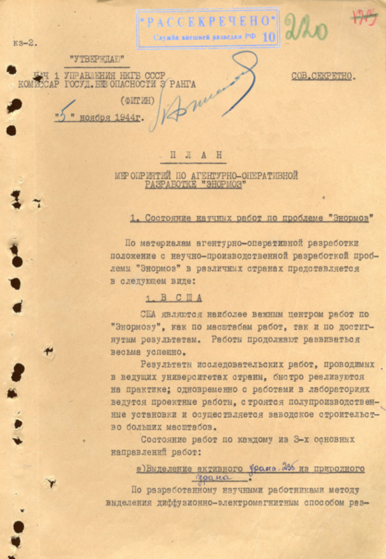 6. В области проблемы «Энормоз» агентурная обстановка является более благоприятной, потому что круг ученых, инженеров и техников, допущенных к этой работе, с каждым днем все более и более расширяется, делая, таким образом, контрразведывательную работу в этом направлении более сложной».