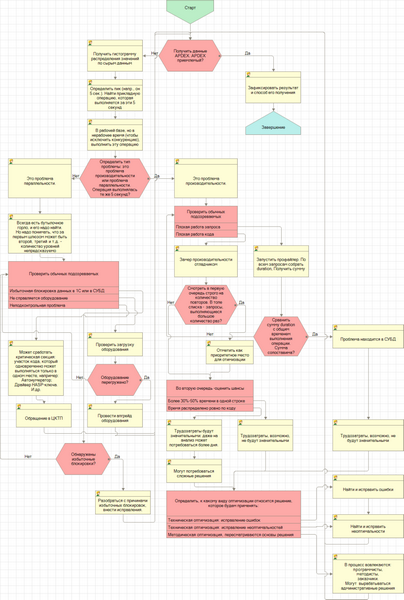 Если же все строки кода имеют малую относительную длительность, а строк много, то длительность работ серьезно возрастает: только на то, чтобы провести анализ ситуации, может уйти день работы. По итогам анализа может быть установлено, что проблема не имеет технического решения, и потребуются сложные методические или даже административные решения, с пересмотром основ конфигурации, с вовлечением в процесс программистов-разработчиков, методистов и заказчиков.