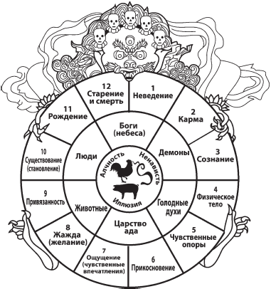 У буддистов единение внутреннего и внешнего миров сплетаются в Колесе Сансары в три круга. Первый, внешний, круг означает демона, который держит в своей пасти 12 первопричин: неведение, карма, сознание, физическое тело, чувственные опоры, прикосновение, ощущение (чувственные впечатления), жажда (желание), привязанность, существование (становление), рождение, старение или смерть. Средний круг вмещает в себя шесть категорий, шесть областей: люди, боги (небеса), демоны, животные, царство ада, голодные духи. А внутренний круг отражает борьбу трех животных начал: вцепившиеся друг другу в хвосты петух (алчность, похоть), змея (зависть, ненависть) и свинья (невежество, иллюзии).