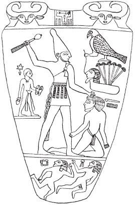 Мы знаем о завоевании и о царе-завоевателе из ряда резных каменных объектов, датирующихся концом додинастического периода: наверший жезлов, рукояток ножей, сланцевых пластин (палетки). Самый полезный из них объект – это палетка Нармера в Каирском