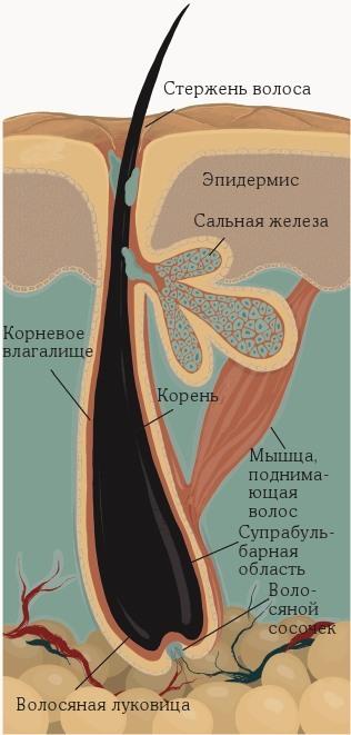 Волосяной фолликул – это оболочка из кожи и соединительной ткани, окружающая корень волоса. Он начинается на поверхности эпидермиса – самого верхнего слоя кожи. Фолликулы, образующие пушковые волосы, заканчиваются у верхнего слоя дермы – следующего за эпидермисом слоя кожи. Фолликулы, образующие терминальные волосы, уходят намного глубже – внутрь дермы, а иногда даже в подкожный слой.