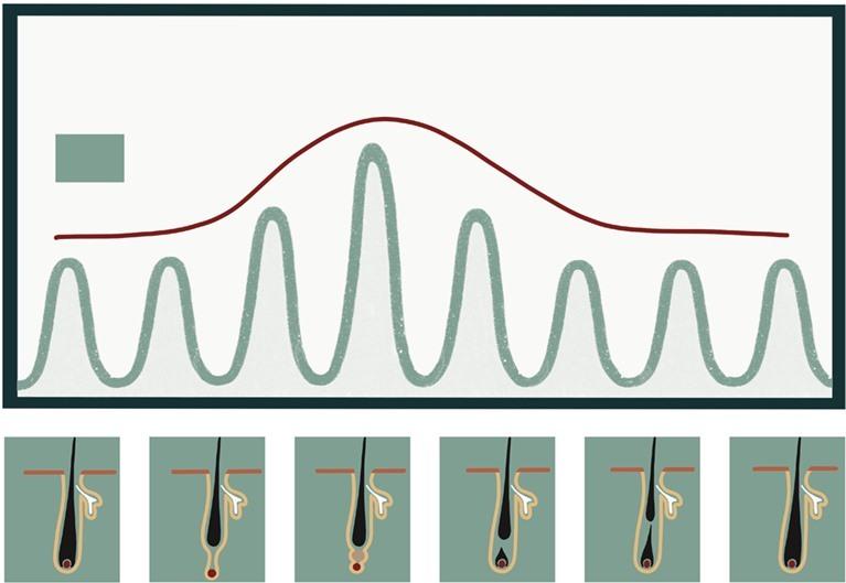 Рисунок 6. Диаграмма, отражающая ритмическую циркадную экспрессию гена Dbp (активатор транскрипции) на разных фазах цикла роста волос. Амплитуда экспрессии Dbp коррелирует с прогрессированием цикла волосяного фолликула: она становится максимальной во время телогена[21].