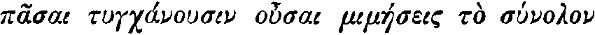 We have arrived at this, then; that Poetry's chief function is to reconcile the inner harmony of Man (his Soul, as we call it) with the outer harmony of the Universe. With this conception of "peerless Poesie" in our minds, we turn to Aristotle's Poetics, and it gives us a sensible shock to read on the first page, that "Epic Poetry and Tragedy, Comedy also and dithyrambic Poetry, and the greater part of the music of the flute and of the lyre are all, generally speaking, modes of imitation" (πασαι τυγχανουσιν ουσαι μιμησεις το συνολον[1]). "What?" we say—"Nothing better than that?"—for "imitation" has a bad name among men and is apt to suggest the ape. But, first bearing in mind that there are imitations and imitations (the Imitatio Christi among them), let us go on to see what it is that in Aristotle's opinion Poetry imitates or copies. It is "the Universal" (το χαθολου[2]): and as soon as we realise this we know ourselves to be on the same track as Aristotle, after all. "Imitation," as he uses it, is not an apish or a slavish imitation; it is no mere transcribing or copying of phenomena as they pass (he even allows that the poet may "imitate" men as "better than they are"): it is an expressing, in fiction and harmonious speech, intelligible to his fellow-men, of what truth, order, harmony, and "law" the poet's mind has apprehended in the outer Universe. No fair-minded reader of the Poetics, as he lays down the treatise, will doubt that this, or something like this, was Aristotle's meaning, nor is it probable that he will find any essential difference (or any difference that seriously disturbs agreement) between Aristotle's "Universal" and the Platonic "Idea" or pattern of things "laid up somewhere in the heavens."