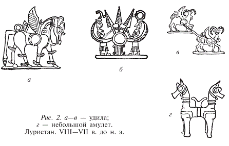 Все заимствования у пришельцев и все нововведения вскоре преобразились, часто с утонченностью и изяществом, исконно луристанским «звериным» стилем (рис. 2). Псалии удил отливались в форме крылатых лошадей, горных козлов, быков и кабанов, изредка в виде замысловатых групп фигур с несущим животных демоном или с животными вокруг священного дерева.