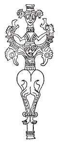 Из литых металлических предметов наиболее замысловатыми являются так называемые «культовые штандарты». Каждый из них состоит из центральной человекоподобной фигуры, имеющей почти цилиндрическую форму высотой приблизительно девять дюймов, с обеих сторон которой располагается пара слегка изогнутых рельефных животных семейства кошачьих, тянущих головы к голове стоящей между ними человекоподобной фигуры. Обычно эта фигура, раскидывая руки, сжимает кошачьи шеи, а к их спинам часто прикреплены второстепенные животные (собаки или хищные птицы). Таким образом формируется единая и не лишенная изящества группа (рис. 3). Известно более 50 культовых штандартов, и в большинстве предметов центральная человекоподобная фигура обладает женскими или, по крайней мере, двуполыми чертами. Иногда она кладет руки себе на грудь в позе плодовитости; она господствует над царством животных и вскармливает их, как львов (царей зверей) и ястребов, так и собак, преследующих львов и поддерживающих, так сказать, равновесие в природе. Это космическая фигура, и мы, не погружаясь слишком глубоко в неизвестность, должны считать ее воплощением главного животворного принципа для богов, людей и животных. Ее плодовитость символизируется рогами муфлона или фаллическим наконечником на голове, ее материнство – человеческими головами (тремя или большим числом), прикрепленными ниже, головами, представляющими либо низших членов в божественной иерархии, либо человеческую или божественную жизнь, происходящую из ее лона.