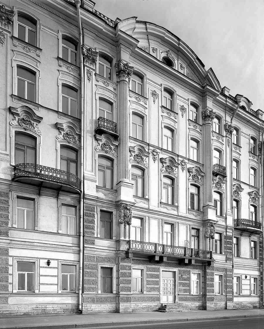 Гуляя по Дворцовой набережной, вы наверняка много раз проходили мимо здания, изображенного на фото, даже не подозревая о его существовании. Это и понятно: особняка в том виде, как он представлен, уже давно не существует. Точнее, он скрыт за длинным фасадом дома № 12–16, сооруженного после войны в стиле так называемого «сталинского ампира». В результате три старинных здания, среднее из которых подверглось разрушению во время бомбардировки, были слиты в одно, к сожалению не украсившее собою невские берега.