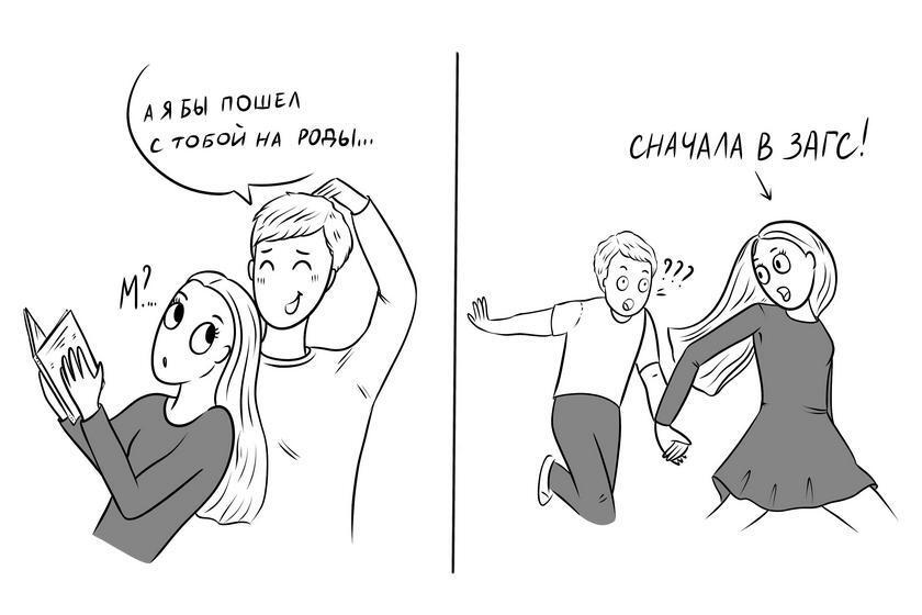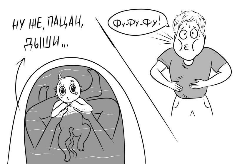 Говорю мужу: «Дыши со мной!!!» в стиле «некогда объяснять», ведь я ему так и не рассказала про типы дыхания. Муж послушно дышит со мной. По нему видно, что не знает зачем, но спросить он бы не решился.