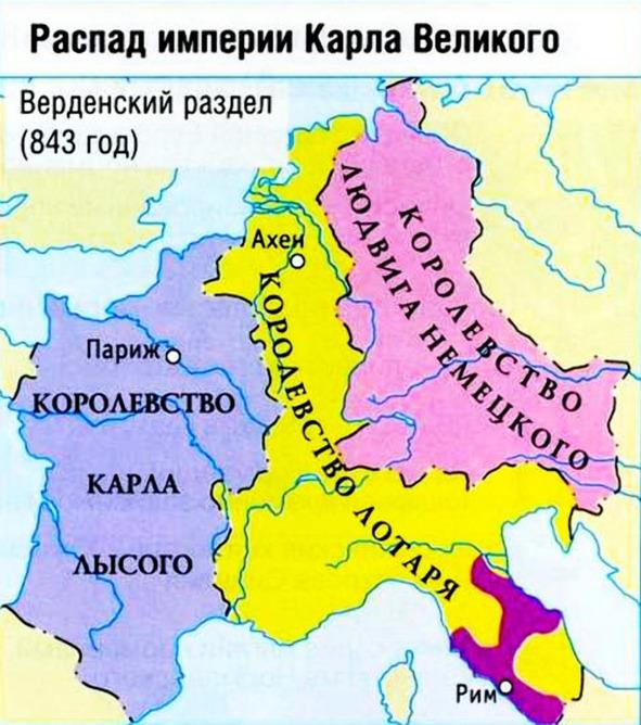 После смерти Людовика I Благочестивого его сыновья — Карл II Лысый и Людовик II Немецкий присягнули на верность друг другу против третьего брата Лотаря I. По Страсбургской клятве империя была разделена между тремя сыновьями, согласно Верденскому договору 843 года. В настоящее время это приблизительная территория современной Германии, Италии и Франции. Имперский титул после непродолжительного объединения в 884—887 годах перестал сохраняться за западной частью империи (ныне территория Франции). Вскоре королевство пережило вторжение викингов, которые впоследствии осели в Нормандии. Норманы — это народ образовавшийся в ходе смешения викингской, франкской и галло-римской крови.