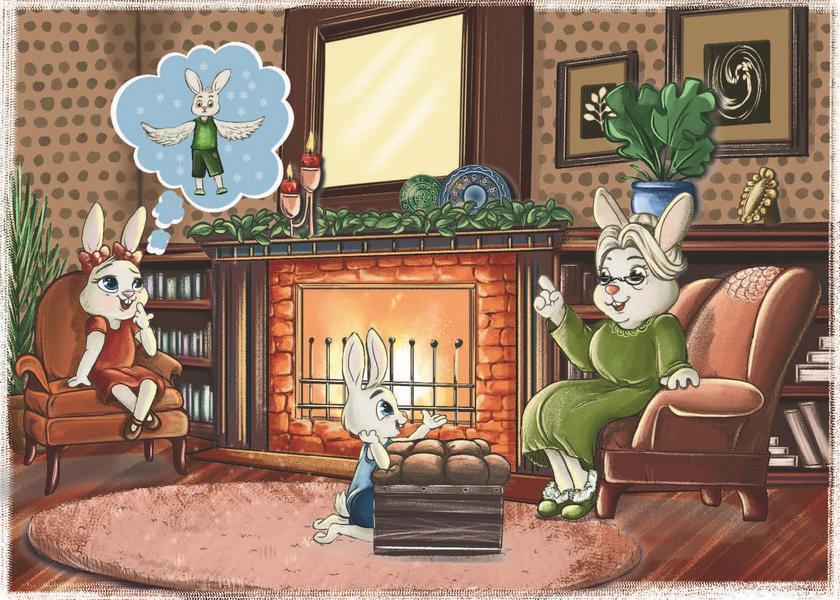 Как-то раз к заячьей семье приехала погостить из соседнего леса бабушка. Шустрик и Неженка уселись рядом с ней у камина и слушали её захватывающие истории о далёких краях.