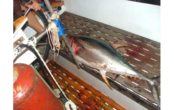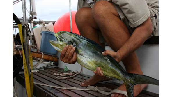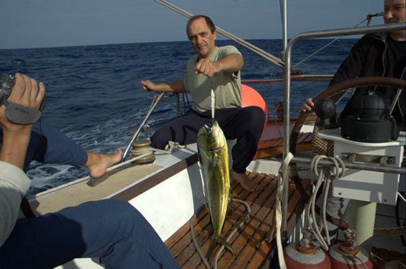 Оставил я одну снасть с кальмарчиком за кормой, Саша пару раз предлагал ее убрать, сожрут, говорит.. Я оставил. Ночью встаю на вахту, потрогал леску на какой случай — там кабанчик висит. Оставил Сашу постоять на руле, надел перчатки, и еле-еле вытащил туну, кило на 8—10. Это тебе не дорада, которая прыгает по поверхности, тут такая тушка на крючке… Так мы ее пять дней ели, вплоть до того, что насильно тонганийцев кормили. Еще сегодня на вечер осталось, сегодня с тушеными бананами. Завтра опять заряжу на рыбалку.