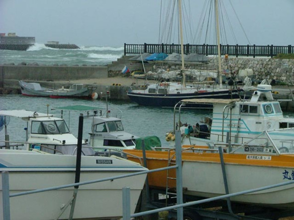 Как-то зима резко взялась нас догонять, надеюсь, снегом нас здесь не засыплет. Волнение сильное не разгоняется, ветер от недалекого корейского берега. Ветер шквалистый, несколько минут дует стабильных 14 метров, потом, примерно столько же — 9. Соответственно, парусов приходится нести на верхнюю границу ветра, и средняя скорость невелика. В такую погоду, тем не менее, море заполнено кальмароловами, ночью все светилось, как днем. Стоят на плавучих якорях, качает их, страшно смотреть.
